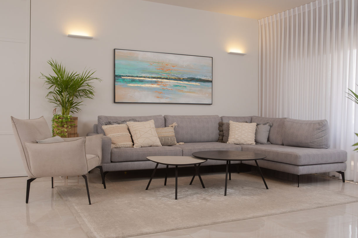 בדירה המשתרעת על שטח של 125 מ"ר ומרפסת של 16 מ"ר, הושקעה מחשבה רבה ביצירת מרחב שיתן מענה לצרכיהם היומיומיים והמשפחתיים של הזוג החביב, תוך שימת דגש על נוחות ואיכות חייהם. החידוש המלא בדירה כלל עבודות אינסטלציה מוקפדות, מערכת חשמל, מיזוג אוויר איכותי, איטום מקצועי, חיפוי וריצוף בניצוחה של המעצבת, עבודות גבס ליצירת קווים נקיים ומעודנים, ושפכטל אמריקאי למראה חלק ואחיד.
